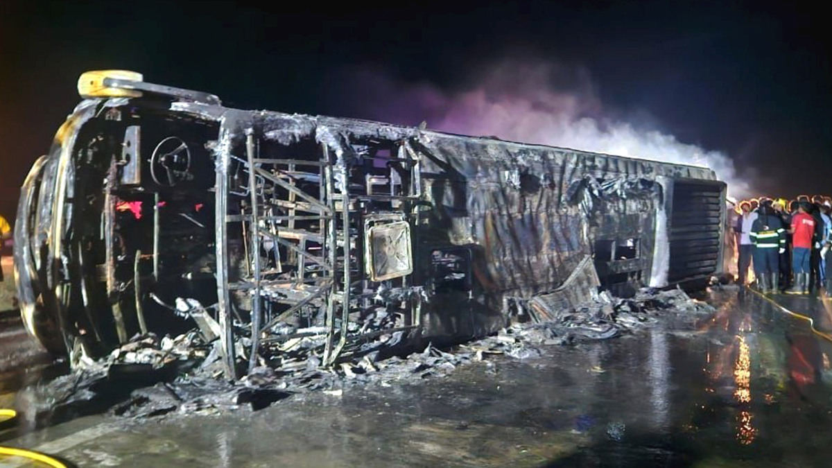 Officials said that the driver told the police that the accident took place after a tyre burst, causing the bus to overturn. Later the diesel tank of the bus caught fire.