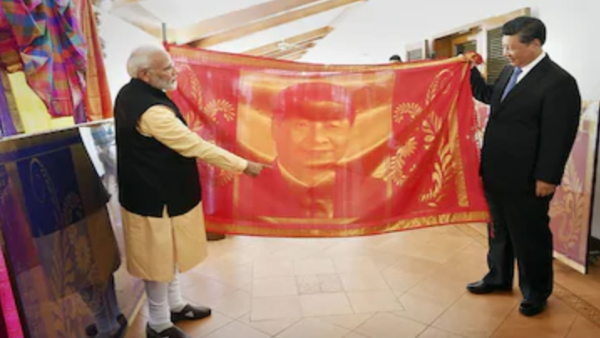 The shawl, with an embossment of the image of Xi in gold which are zari embellishments on bright red silk background was displayed by Modi to Xi at Mamallapuram.
