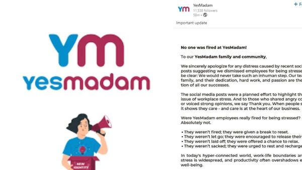 The company titled its LinkedIn post "Important Update", expressing regret for any distress the email may have caused. "No one was fired at YesMadam!" they emphasized in their statement, adding, "We sincerely apologise for any distress caused by recent social media posts suggesting we dismissed employees for being stressed. Let us be clear: We would never take such an inhuman step." YesMadam sought to clarify its stance and intentions, highlighting that their goal was never to penalize employees for experiencing stress but rather to initiate a conversation about the pressing issue of workplace mental health.