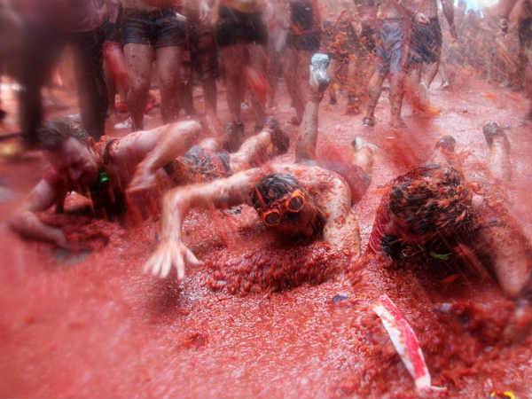 The bang of fireworks set off the bedlam at 11 am. Revellers jammed shoulder-to-shoulder, many wearing just bathing suits, bent down to pick up tomatoes from the ground to throw while others lay in the pulp.