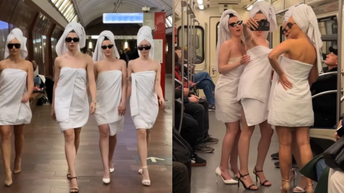 An Instagram account named mimisskate shared the video showing these three women confidently walking through the metro. They wore black sunglasses, towels on their heads, and bath towels around their bodies. This peculiar attire has sparked widespread attention online.