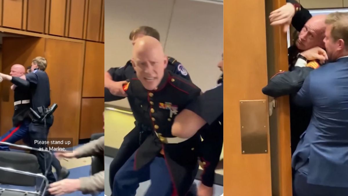 The protester was identified as Brian McGinnis, a Marine Corps veteran who was attending the hearing in dress uniform. According to reports, he stood up during the session and began shouting against US military action involving Israel and Iran.
