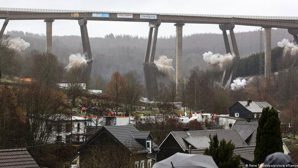Berlin, Feb 07: Demolition crews used around 120 kilograms (265 pounds) of explosives on Sunday to destroy the Rinsdorf viaduct on Germany's A45 autobahn near Wilnsdorf in the state of North Rhine-Westphalia. The bridge was 70-meter-tall (230 feet) and had spanned 500 meters (1640 feet).