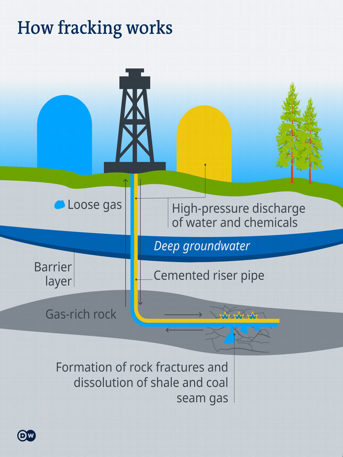 Here fracking fluid made up of water, sand and chemicals is injected up to 5 kilometers (3 miles) under the earth to break up the bedrock and extract gas. The process uses vast amounts of water and could contaminate groundwater that is already receding due to persistent drought in Germany.