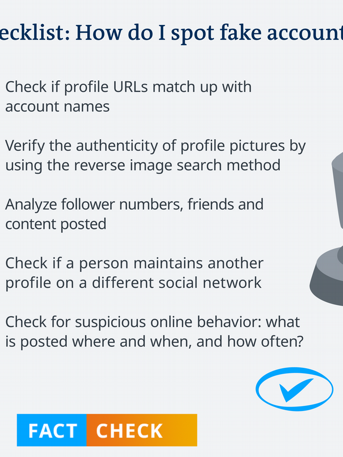 Also study the kind of content posted by an account. Does it match the person, or does it seem out of character? If someone constantly changes his or her location, this should raise eyebrows — unless the individual works as a travel blogger, war correspondent or in a similar capacity. Be wary of persons sharing content they seem to have little or no connection to. A German student posting images purporting to show an Afghan war zone? A Russian pensioner sharing photos from what she claims are Parisian anti-vaccination protests? Neither case seems particularly plausible. Both could well be fake accounts, or at least be sharing unverified misinformation.