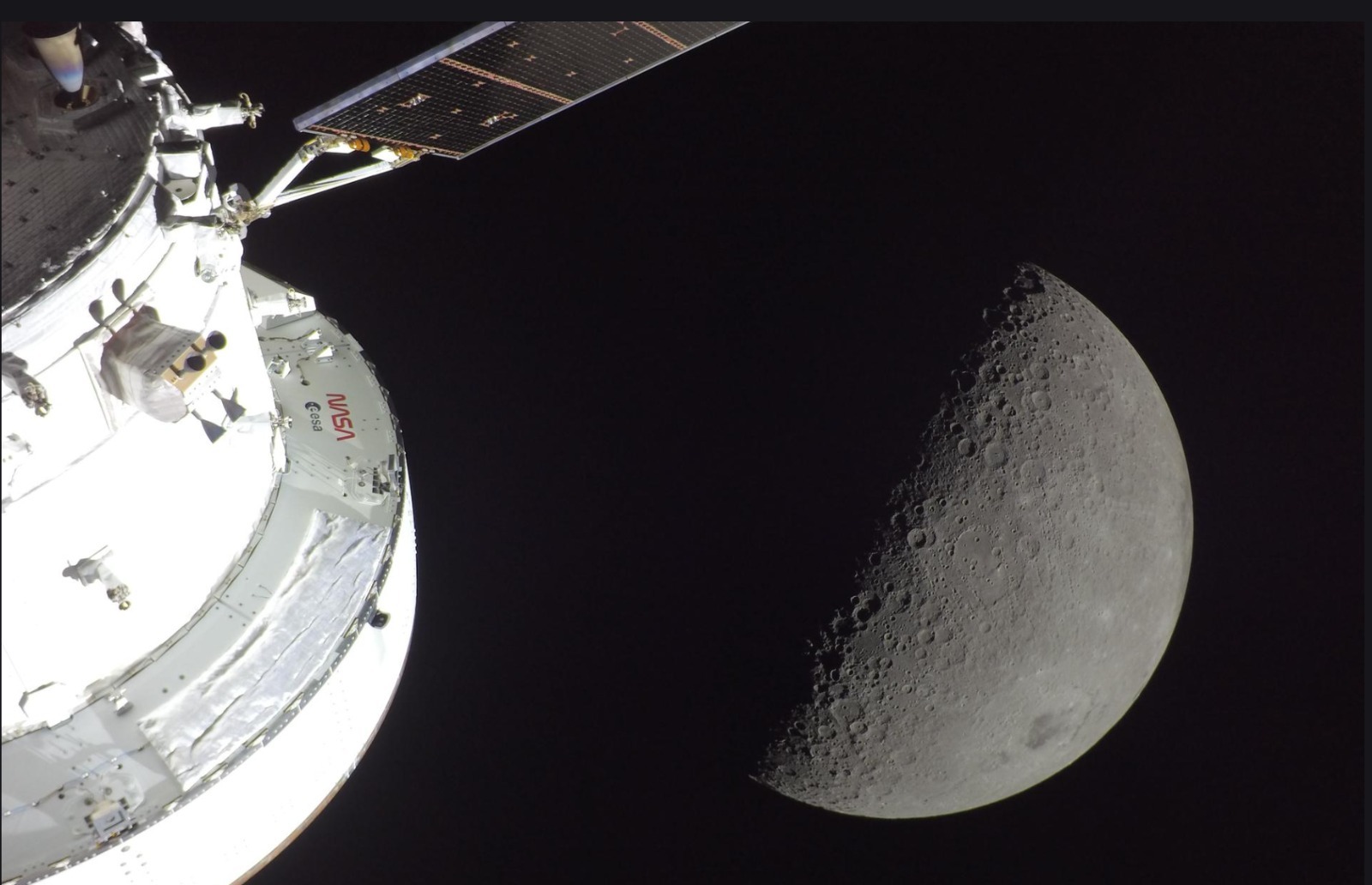 As Orion swung around the far side, an external camera captured one of the most striking images in the history of human spaceflight: the Orion service module — its solar panels stretched wide, its NASA and ESA markings glinting in sunlight — suspended in the darkness beside a first-quarter Moon, its craters etched in razor-sharp detail.