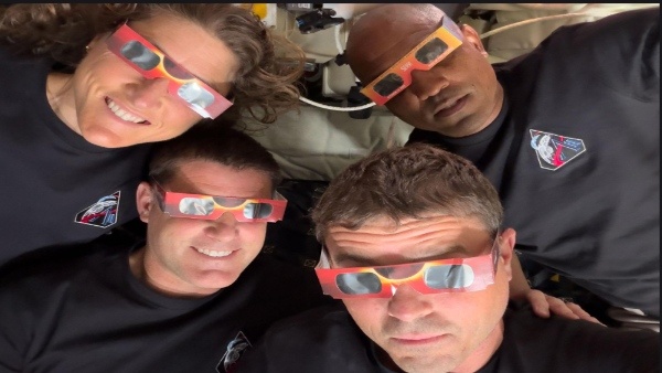 The Artemis II crew wearing eclipse viewers aboard Orion, April 6, 2026. From top left: Christina Koch, Victor Glover, Reid Wiseman, Jeremy Hansen. Credit: NASA