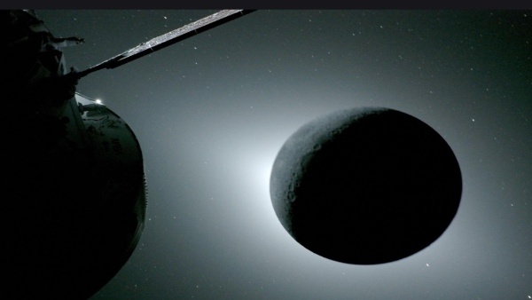 NASA's Orion spacecraft lit by the Sun, with the first-quarter Moon visible behind it. Taken by an external camera during the lunar flyby on April 6, 2026. Credit: NASA