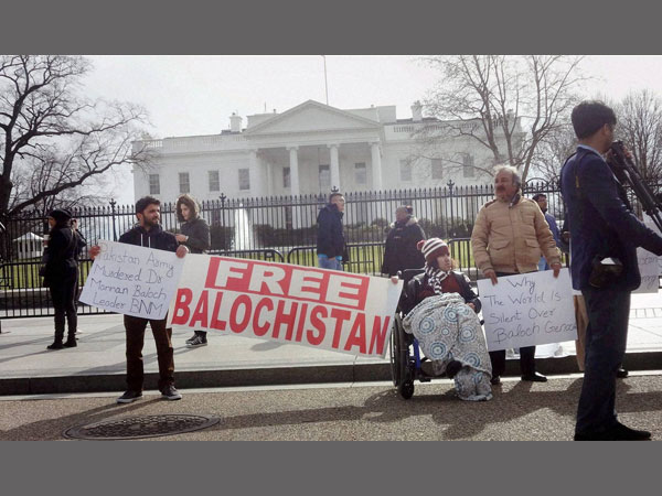 Waving the US and Baloch flags, the small group of protesters held banners of 'Stop Human Rights violation in Baluchistan', 'Stop Bombing Balochistan' and 'Balochistan is not Pakistan' and stood around five dolls, smeared in red colour to portray blood and placed on the ground on a white banner that read 'Save Baloch Children'.