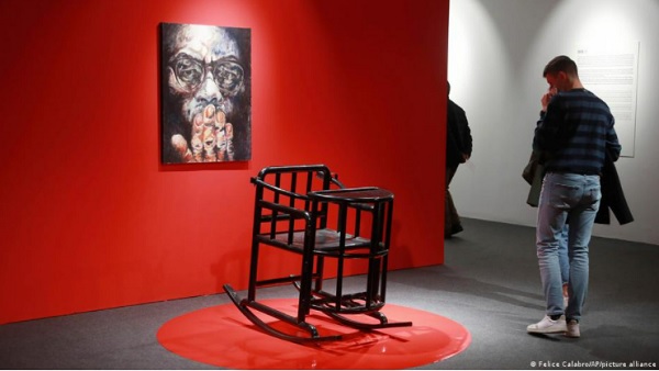 The exhibition also includes a torture device that has been re-designed as a rocking chair. For the first few days of the exhibit, Badiucao will sit in the torture chair and read from a diary that was sent to him by a resident in Wuhan. The work details 100 days of records from the early stages of the coronavirus pandemic.