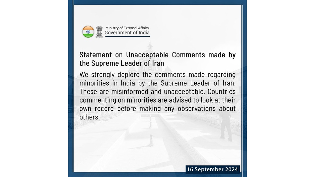 India has strongly condemned recent comments made by Iran's Supreme Leader, Ayatollah Ali Khamenei, regarding the situation of minorities in India.