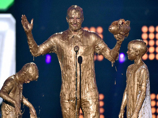 David Beckham and his sons, Romeo and Cruz, get slimed as Beckham accepts the legend award at the Kids' Choice Sports Awards at UCLA's Pauley Pavilion in Los Angeles.