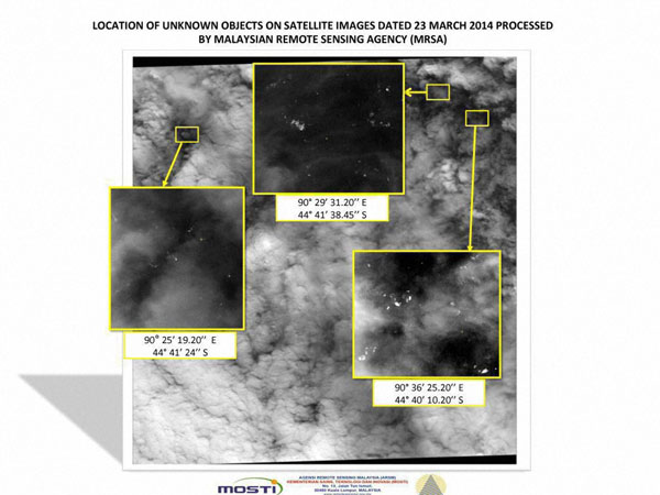 This graphic released by the Malaysian Remote Sensing Agency on Wednesday March 26, 2014, shows satellite imagery taken on March 23, 2014, with the approximate positions of objects seen floating in the southern Indian Ocean in the search zone for the missing Malaysia Airlines Flight 370. Malaysian Defense Minister Hishammuddin Hussein said at a news conference in Kuala Lumpur Wednesday that a satellite has captured images of 122 objects close to where three other satellites previously detected objects.