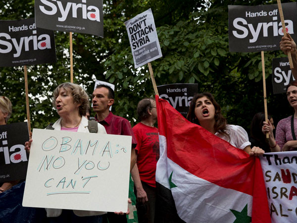 There have been several protests and demonstrations telling US to not attack Syria. OneIndia News brings you the pictures showing the demonstrations being staged to protest war against Syria.