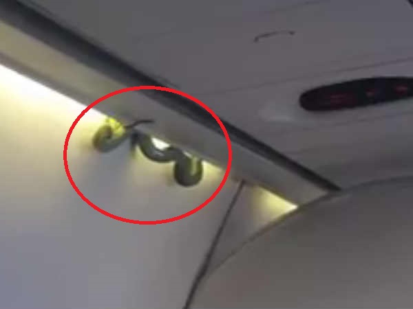 Cellphone video shot by passenger Indalecio Medina showed it wriggling briefly as if trapped before partially dropping down into the cabin. "I was reading a magazine and the passenger next to me saw it and, 'Oh my word!'" Medina told The Associated Press by phone yesterday.