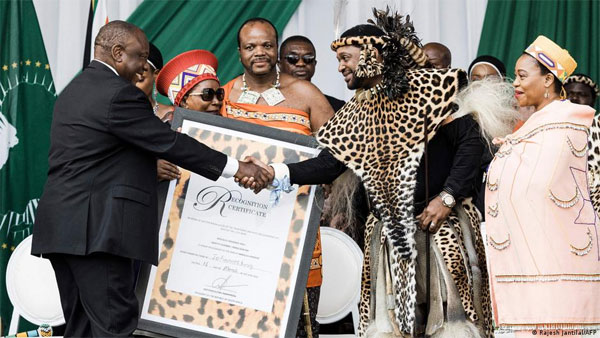 The formalities included Ramaphosa handing over a giant framed certificate in front of tens of thousands of people — mostly Zulus dressed in their traditional attire and carrying shields and clubs.