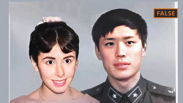 The other image shows young Hu Xijin. A reverse image search leads to a tweet by the journalist himself in which he writes about his time in the Chinese military ("unforgettable years") and contains the photo that now appears in the alleged wedding picture.