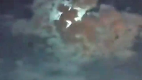 The video shows a ball of fire plummeting from the sky as it hides behind the clouds for a very brief moment, it bursts into a blinding light, turning the whole sky green.