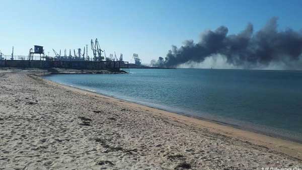 Amateur video footage, filmed from Berdyansk, showed a large plume of smoke emanating from a fire on a large gray ship, as well as a large explosion.