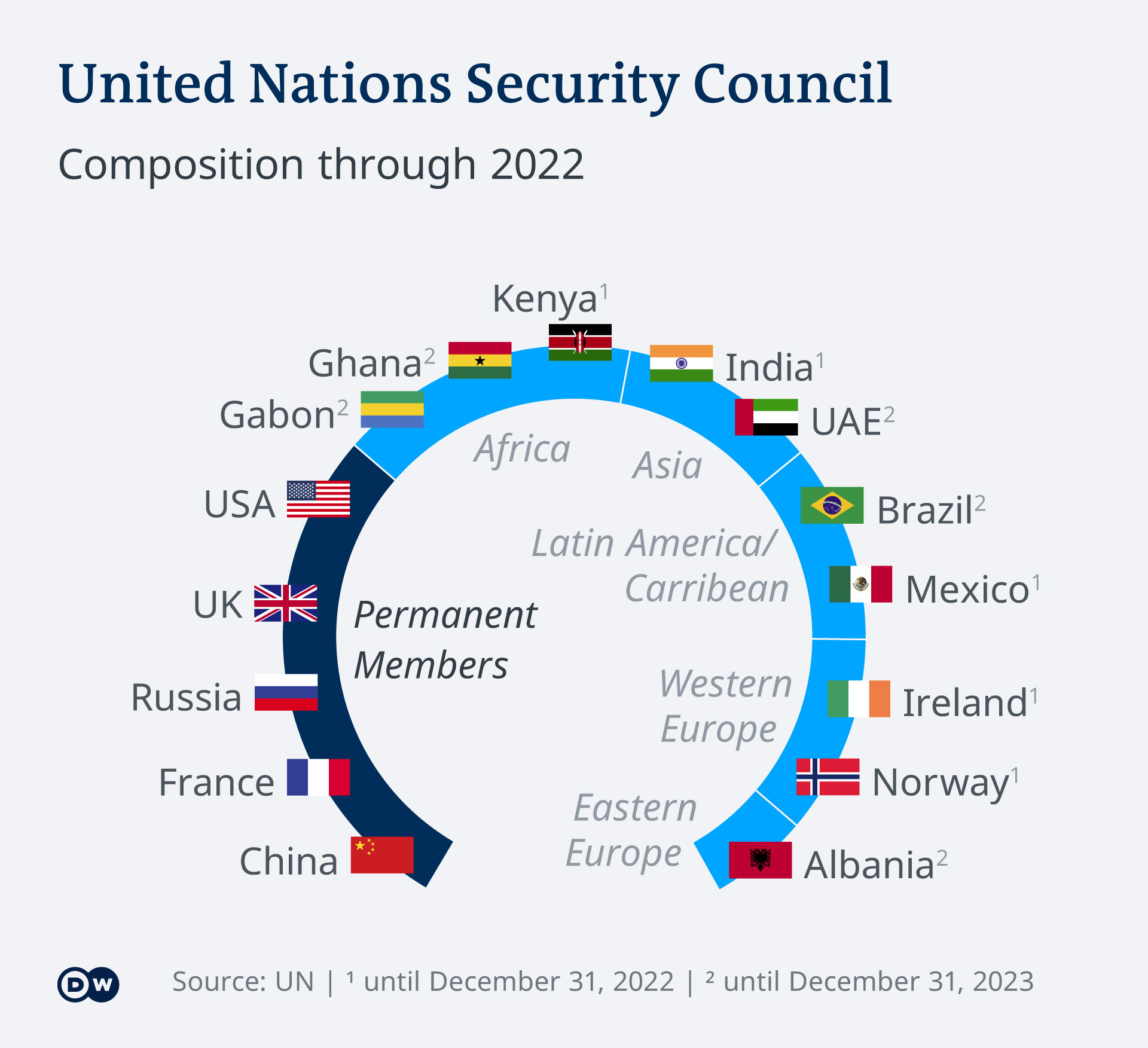 The composition of this inner circle reflects the geopolitical situation of 80 years ago. The permanent members are the victors of World War II, plus China. Back then, many countries in the world — including almost all of Africa — were still under colonial rule.