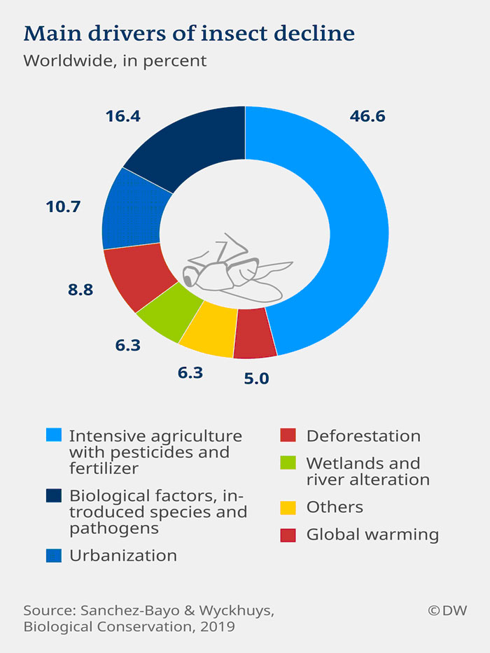 Without algae or trees, there would be no oxygen. And without insects to pollinate plants, our harvests would be meager at best. More than two-thirds of all crops, including many fruits and vegetables, coffee and cocoa, depend on natural pollinators like insects. But already today, one-third of all insect species worldwide are threatened with extinction.
