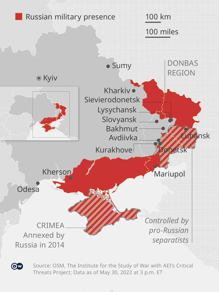 Sievierodonetsk and neighboring Lyssychansk are the last major cities in the Luhansk area — the Donetsk and Luhansk regions are known collectively as the Donbas — still controlled by Kyiv. According to Ukraine's General Staff, Russia is intent on capturing Sievierodonetsk. Ukrainian troops defending the region risk being trapped, as they were in Mariupol.