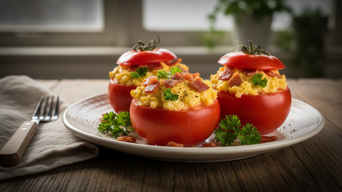 These bacon and egg stuffed tomatoes fit well in a breakfast spread or as a light meal. The mix of eggs, bacon, and fresh tomato suits Southern and wider American cuisine tastes. You may place them on a simple plate or a large platter so each person can pick one stuffed tomato.