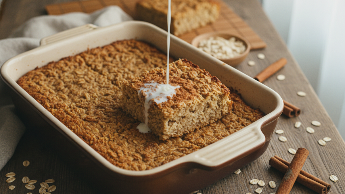 Baked oatmeal is a simple baked breakfast that uses common pantry ingredients. By changing the sugar, milk, and fat as shown, you can make either a richer dairy version or a soy-based variation while keeping the same easy oven method.