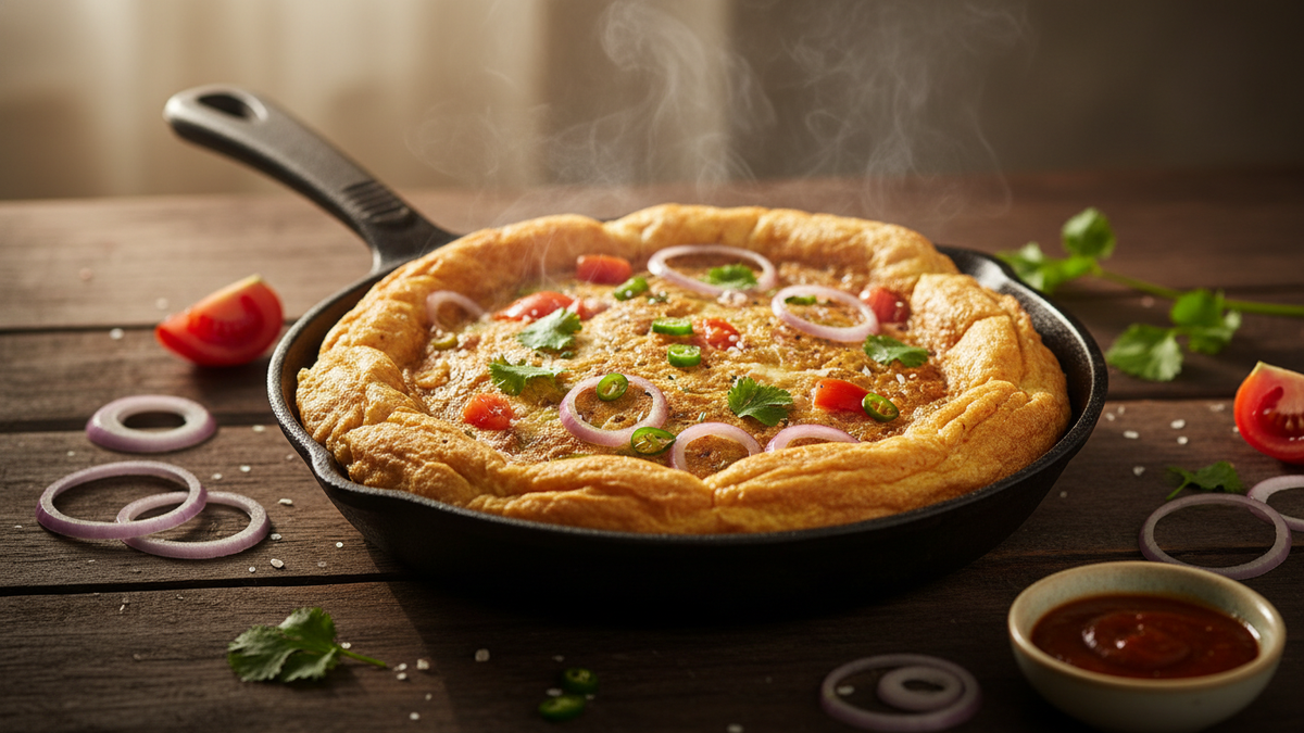 Nutrient Amount Energy Approx. 260 kcal Protein Approx. 14 g Total fat Approx. 20 g Saturated fat Approx. 4.5 g Carbohydrates Approx. 6 g Fibre Approx. 1.5 g Sodium Approx. 520 mg This Indian omelet recipe keeps the process short while using common Indian pantry items. By mixing onions, tomatoes, coriander, cumin, and chillies directly into the eggs, you get flavour in every bite with little effort. It is a handy dish for breakfast or any time you want a simple egg-based meal.