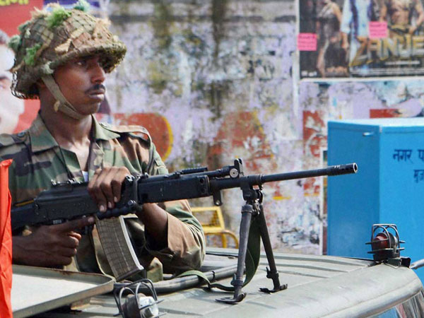 Security men keep vigil during the curfew in the riot-hit area of Khalapar near Muzaffarnagar on Wednesday.
