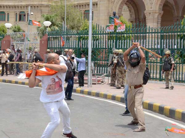 TV reports showed visuals where the UP police personnel had to lathicharge the protesting BJP youth workers outside Uttar Pradesh Assembly.