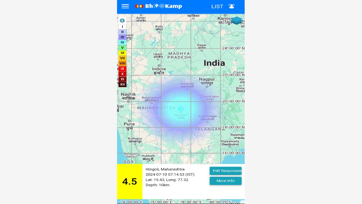 The NCS confirmed the specifics of the event in a post on X, formerly Twitter, "EQ of M: 4.5, On 10/07/2024 07:14:53 IST, Lat: 19.43 N, Long: 77.32 E, Depth: 10 Km, Location: Hingoli, Maharashtra."