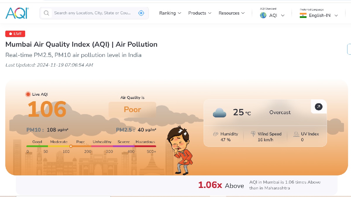 The air quality in Mumbai has dipped to poor levels, with major pollutants exceeding safe limits, according to aqi.in. The current Air Quality Index (AQI) in the city stands at 106, which is 1.06 times higher than the average AQI recorded across Maharashtra. The poor air quality is primarily due to elevated levels of particulate matter, especially PM10 and PM2.5.