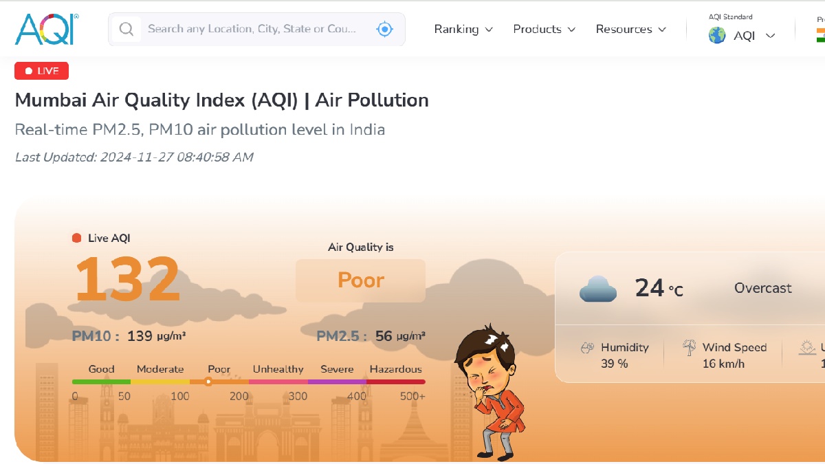 Mumbai's air quality has been categorised as poor, with the city's Air Quality Index (AQI) recorded at 132 today, according to aqi.in. Mumbai ranks 240th among the most polluted cities globally. The city's AQI is 1.14 times higher than the average AQI levels recorded across Maharashtra. The levels of particulate matter, such as PM2.5 and PM10, remain concerning, impacting public health.