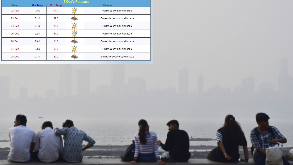 On December 24, Mumbai will have a partly cloudy sky with haze. The temperature is expected to range between 21 degrees Celsius and 31 degrees Celsius.