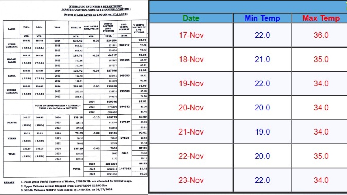 As of November 17 at 09:20 am, the water stock in the seven lakes supplying water to Mumbai remains stable. These lakes are sources for the city's water supply. The Brihanmumbai Municipal Corporation shared the following data: