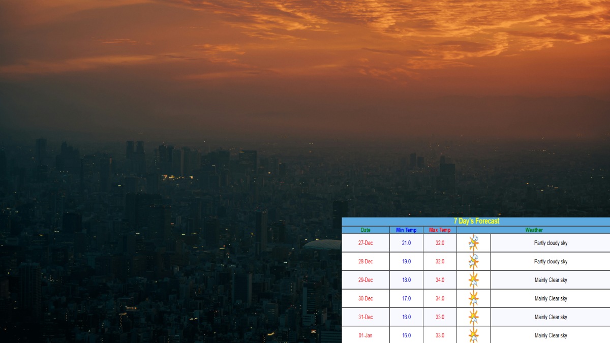 On December 31, the weather will again be mainly clear, with temperatures starting at 16 degrees Celsius in the morning and reaching 33 degrees Celsius during the day.
