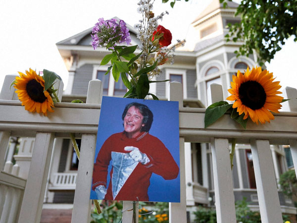 A photo of the late actor Robin Williams as Mork from Ork hangs with flowers left by people paying their respects, in Boulder, Colorado at the home where his hit 80's TV series "Mork & Mindy", was set.