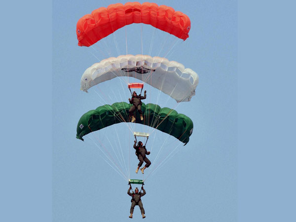 IAF paratroopers perform during the full dress rehearsal for the Air Force Day Parade, at Air Force Station Hindon in Ghaziabad.