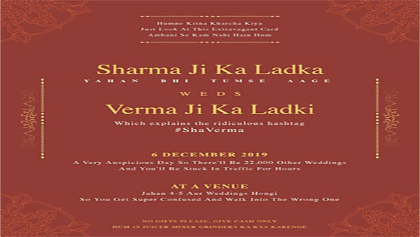In the epic wedding card, Akshar talks about a wedding between "Sharma ji ka ladka" and "Verma ji ki ladki" and takes a jibe at the craze of the wedding hashtags, which in this case is #ShaVerma inferring the food Shawarma.