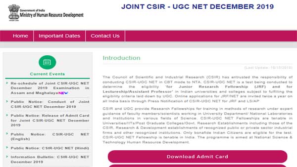The exams in Meghalaya and Assam would be conducted on December 27, 2019. The fresh admit cards too have been released for the purpose. The result once declared will be available on csirnet.nta.nic.in.
