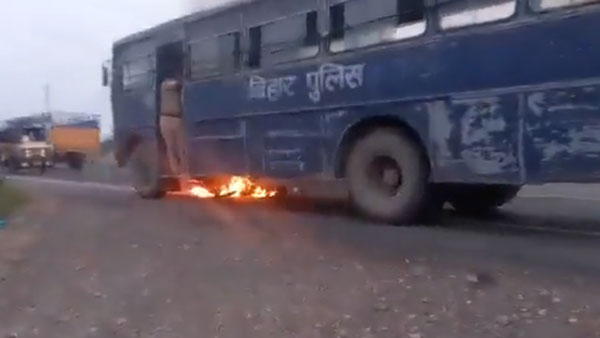 The cops, who escaped from the jaws of death, are seen running out of the bus and watching the man being burnt alive.