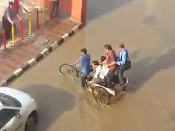 Monsoon hits Delhi and so does long traffic jams and water logged streets. This video these days is creating hype on social media. This is Mundka metro station in Delhi and a rickshaw puller charges 5 Rs each from people to carry them from one stretch to the other which is hardly few seconds away. Watch funny video. Video Courtesy - Sushant Kudesia