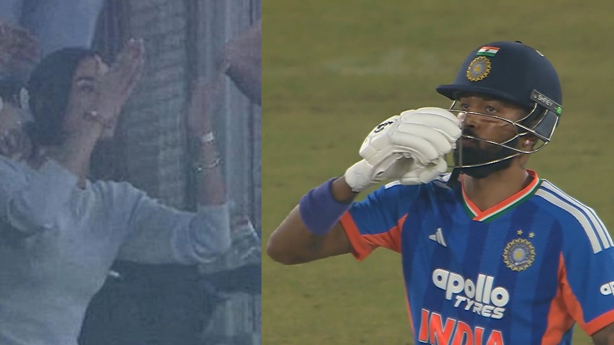 Pandya's innings carried extra emotion as cameras caught flying kisses blown towards girlfriend Mahieka Sharma in the stands after the half-century. The all-rounder finished with 63 from 25 balls, striking five fours and five sixes, and helped power India well beyond 230 on a black-soil surface that encouraged stroke play.