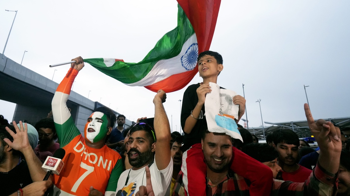 The T20 World Cup-winning Indian cricket team returned to the country here on Thursday aboard a specially-arranged charter flight with scores of fans lining up outside the airport to welcome the players despite a steady drizzle and heavy security deployment that kept them at a distance from their heroes. Hundreds of supporters, holding placards congratulating their favourites and waving the national flag, braved the weather to welcome the victorious side, which defeated South Africa by seven runs in the final in Bridgetown on Saturday last week.