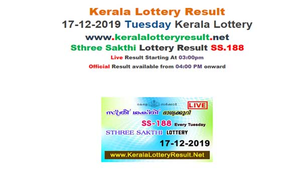There is a consolation prize of Rs 8,000. The fourth, fifth, sixth and seventh prizes are Rs 2,000, 1,000, 500 and 200. The 8th prize is Rs 100. The result are available on https://www.keralalotteryresult.net/2019/12/kerala-lottery-result-17-12-2019-sthree-sakthi-ss-188.html.